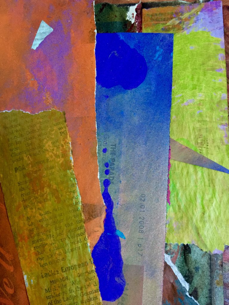 In quasi-retirement, she was mentored in the fine art of collage and assemblage, and while she is intrigued as a crow with tools and colors and she is swift to return to her love of “forgiving” collage and assemblage. Currently, she is obsessed with Oliver Sacks, and wonders why The New Yorker recently did a “hit piece” on him. Sacks was a huge believer in the power of music therapy, art therapy, play therapy, physical therapy … you get the idea. Here’s an example with a piece called A Nancy Migraine.